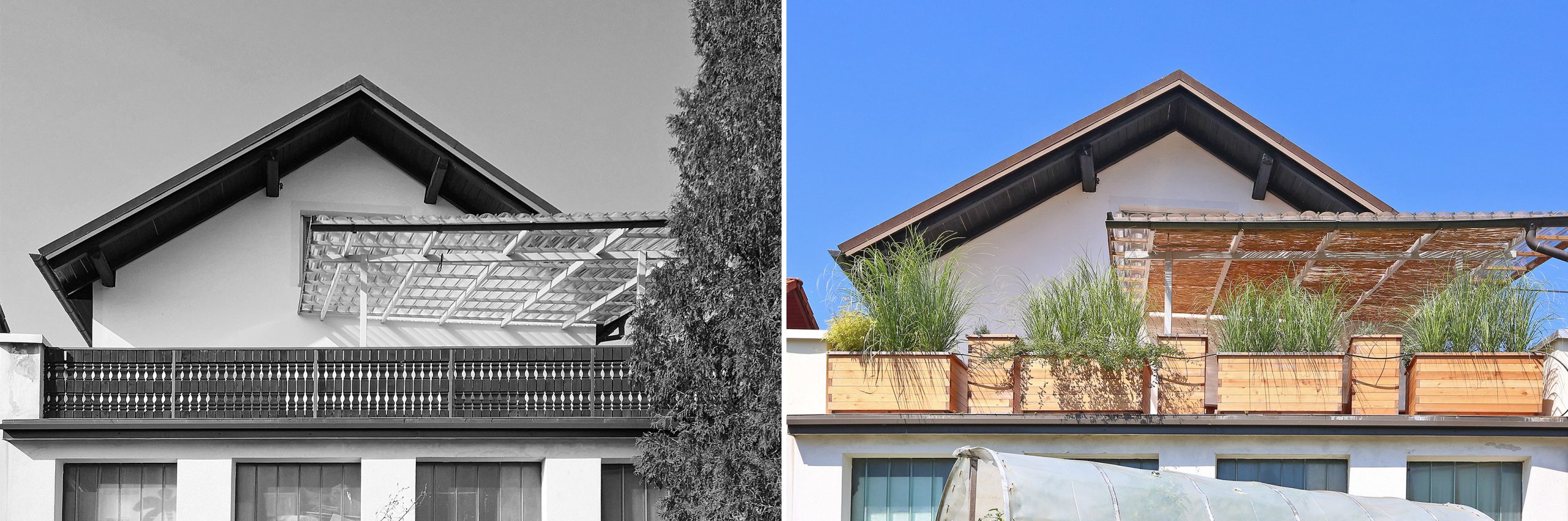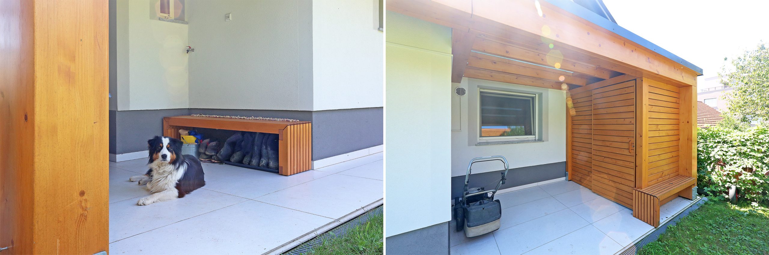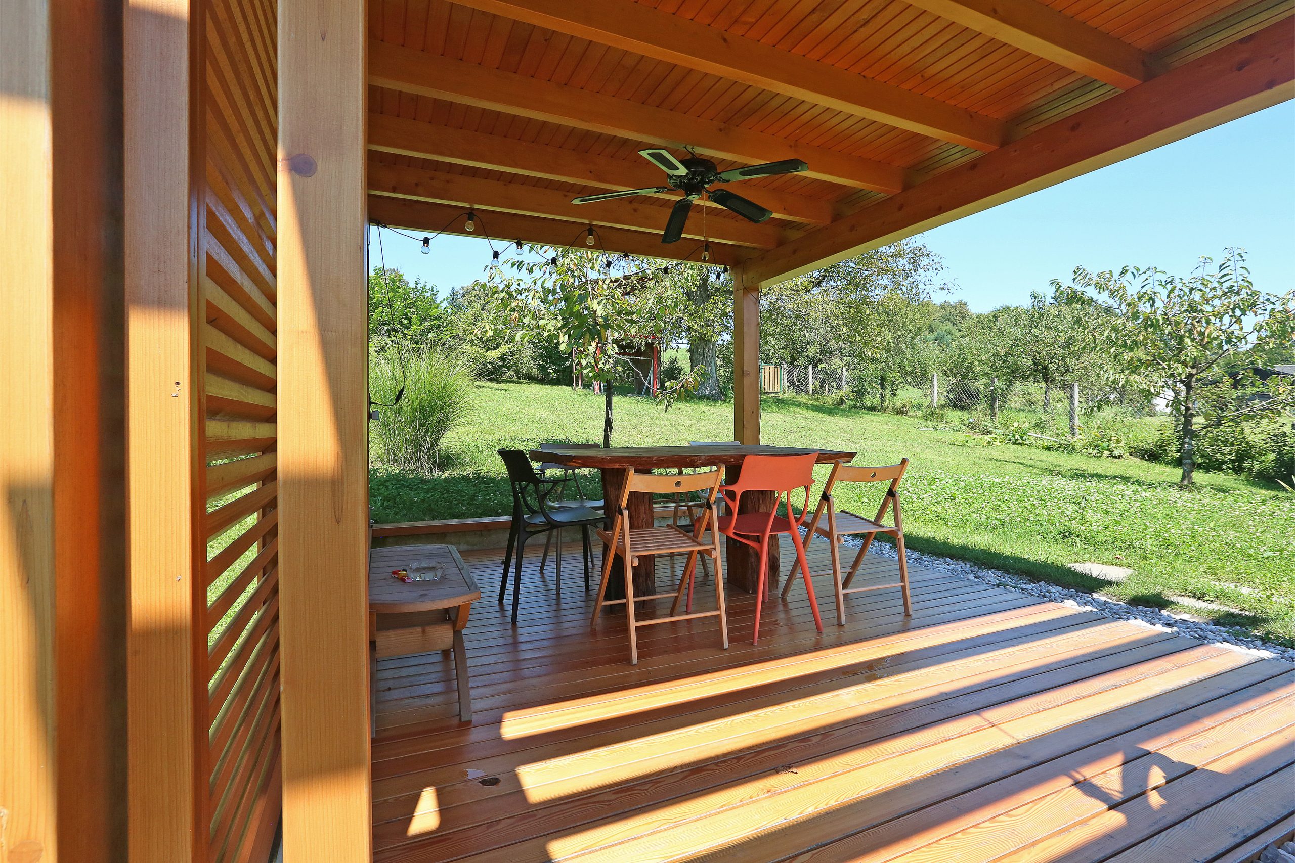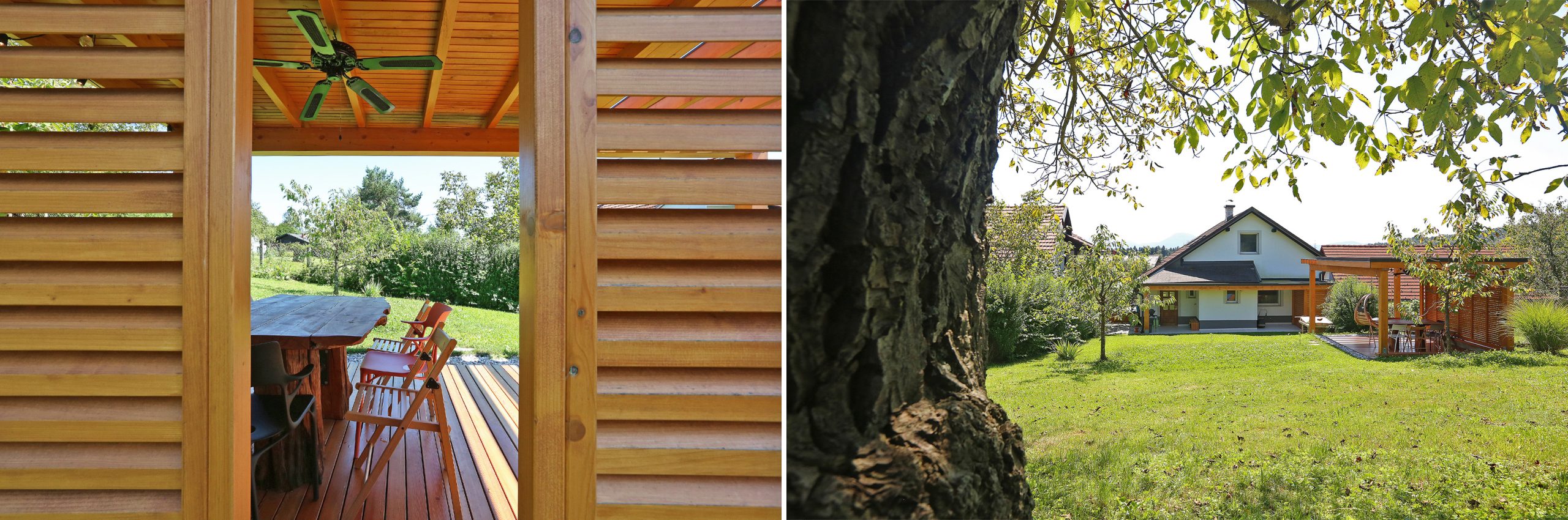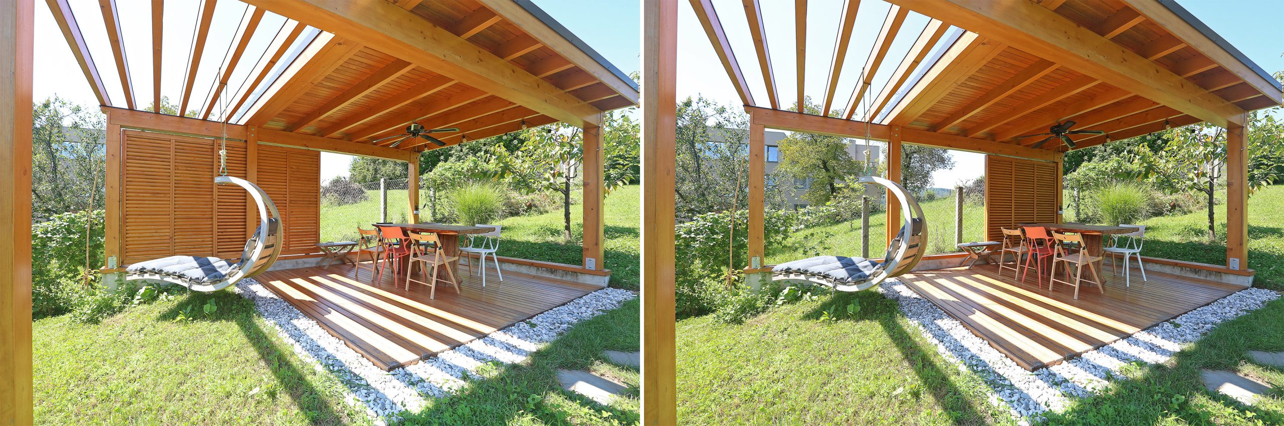 Smrekova konstrukcija nadstreška zagotavlja zavetje pred vremenskimi vplivi, odprtost pa omogoča zlitje s krajino v brežini. Na daljši betonski zidec so vpete tračnice za pomična senčila, zidec krajše stranice pa služi podpori za dodatna sedišča. Vloga pomičnih senčil je prilagajanje svetlobe in prezračevanje, kar prispeva k naravni mikroklimi prostora. Nadstrešek se naravno podaljšuje v pergolo, ki s svojo konstrukcijo ustvarja igro svetlobe in senc. V prihodnje jo bo obrasla vzpenjavka Actinidia deliciosa Atlas (kivi), saj bo poskrbela za dodatno senčenje ter še tesnejšo povezavo z vrtom. Načrtovana preureditev je prinesla tudi spremembo lokacije starega paviljona. Z večjo in višjo oddaljitvijo nadstreška od hiše ter pomikom na zahodno lego so stanovalci pridobili celodnevno osončenost ter ozelenjene razglede proti vzhodnemu delu vrta. Tu mogočna drevesa – hrast, češnje, bezeg in celo ginko – ustvarjajo pravljično kuliso za srečevanja s samim seboj.