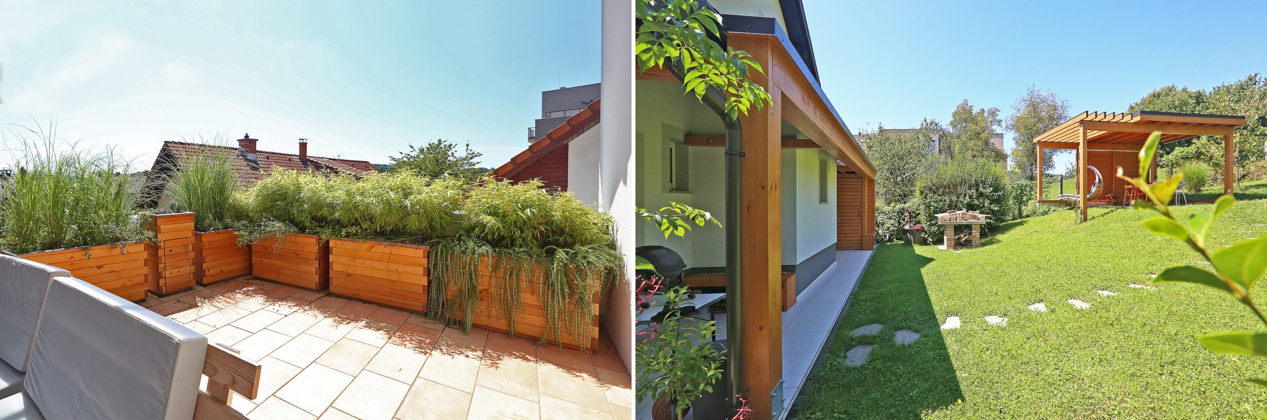 Projektna naloga je iskala uravnoteženost med arhitekturno zasnovo in naravno krajino ter prinesla ureditev v treh conah. Namesto ograje je južna terasa dobila visoka lesena korita. Ta služijo kot shrambne omarice ter prostor za rast trajnic in zelišč, ki jih mama uporablja pri kuhi. Preureditev severnega vrta v hribini, kjer so združeni vkopani nadstrešek iz smrekovega lesa, pergola s pomičnimi senčili in macesnova talna obloga. Zavetje hišnega portala z vrtno lopo in klopcama je idealni kotiček, ki nudi poletni hlad dvo ali štirinožnim bitjem.