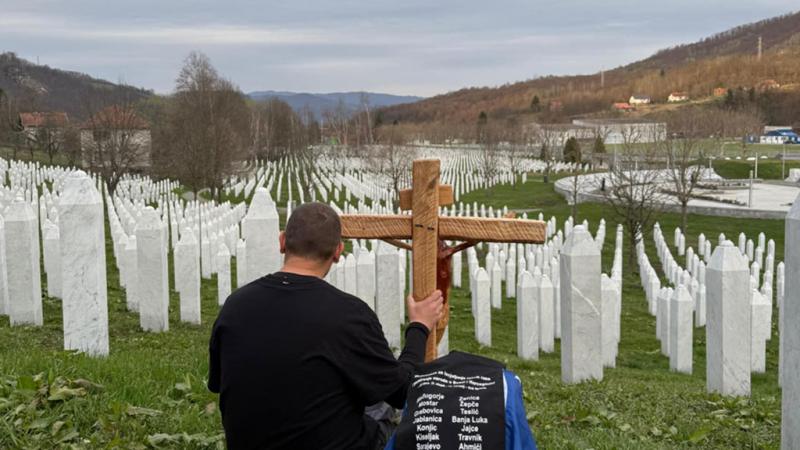 Moški, ki s križem na ramenih hodi čez Bosno – da bi prinesel mir in ozdravil rane