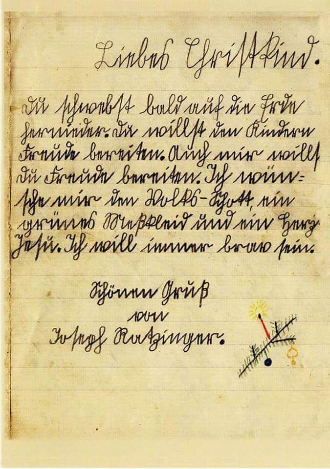 “Dragi otrok Jezus, hitro pridi na zemljo. Otrokom boš prinesel veselje. Prinesi tudi meni veselje. Rad bi Volks-Schott (mašni molitvenik), zelena mašna oblačila in Jezusovo srce. Vedno bom dober. Pozdrav od Josepha Ratzingerja.” Božič 1934