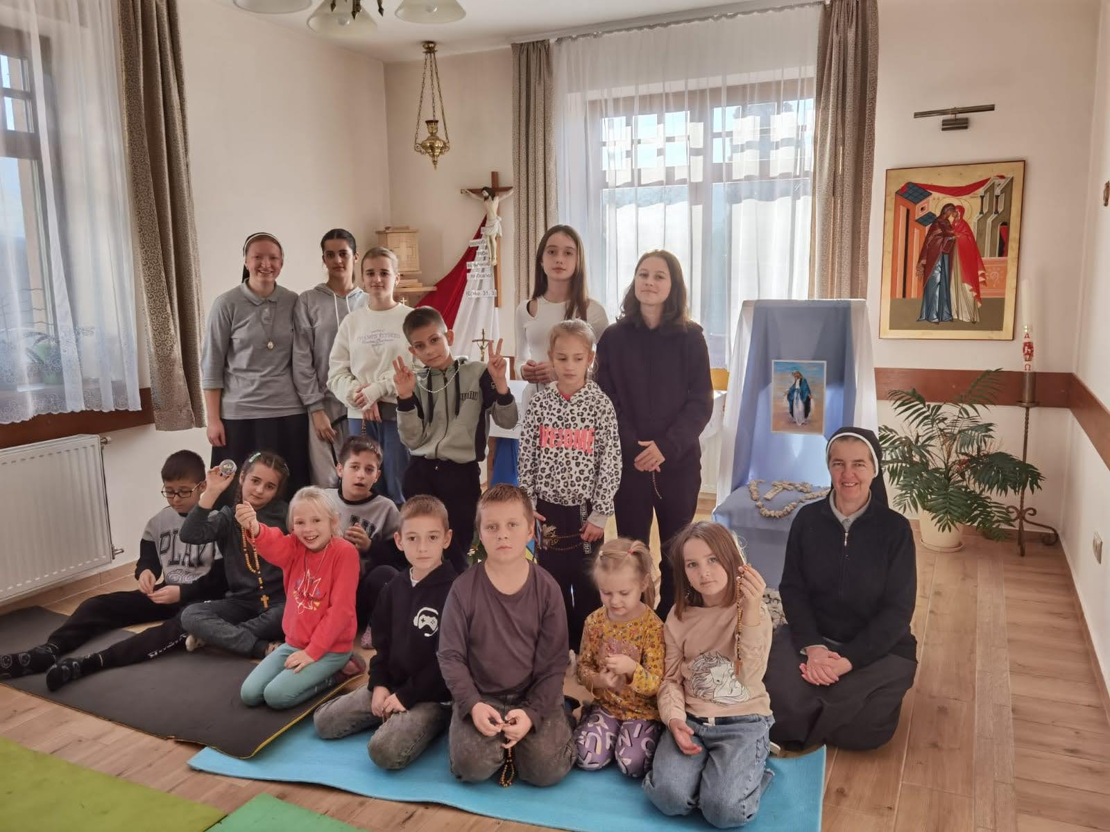 V Kijevu sestre služijo brezdomcem. Tukaj, na Zakarpatju, pa pomagamo bolnikom v naši in nekaj sosednjih vaseh. Jaz imam verouk, tudi kateheze Dobrega pastirja. Imam skupine od 1-3, 3-6 let, skupino po prvem svetem obhajilu in mlade. Začeli smo tudi s katehezo za odrasle. Prvotno smo jo namenili staršem otrok, ampak prihajajo predvsem starejši. Skupine so majhne. V eni skupini je 6-8 otrok, v skupini po prvem svetem obhajilu 15. Katehezo pa imam tudi v šoli. Temu ne rečemo verouk, ampak etika. V resnici govorim vse bolj na splošno, govorim pa o Bogu.