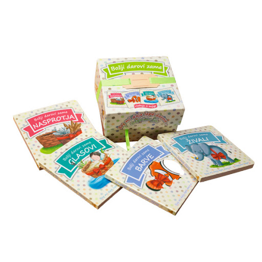 V darilni škatlici so štiri kartonke: Živali, Barve, Nasprotja, Glasovi. Škatlica že na zunaj spominja na darilo in kar kliče, da jo podarimo ob rojstvu, krstu ali prvih rojstnih dneh.
