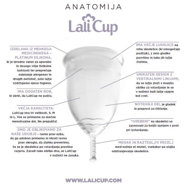 - da so menstrualne skodelice izdelane iz medicinskega silikona, ki za razliko od materialov, uporabljenih v klasičnih higienskih pripomočkih, ne povzroča alergij?