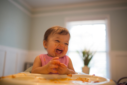 Tudi pri hranjenju ji pogosto omogočim, da se hrani sama. To seveda vključuje obilno mero packanja skozi moje odrasle oči, skozi njene otroške pa izkušanje novega, doslej nepoznanega. Sorodstvo seveda zavija z očmi, veljam za nemogočo mamo, po drugi strani pa dete žanje salve navdušenja zaradi samostojnosti pri hranjenju. Moje spodbude pri tem seveda nimajo nič, ampak to je že druga debata.
